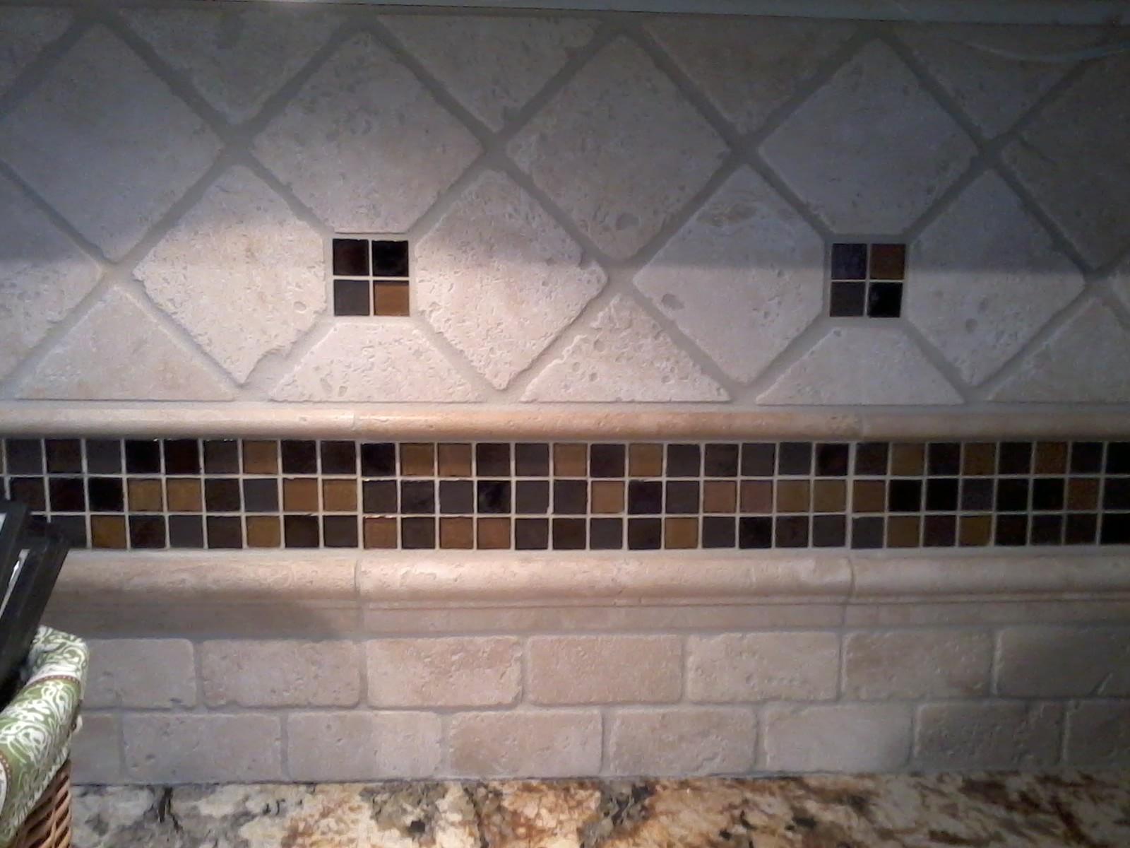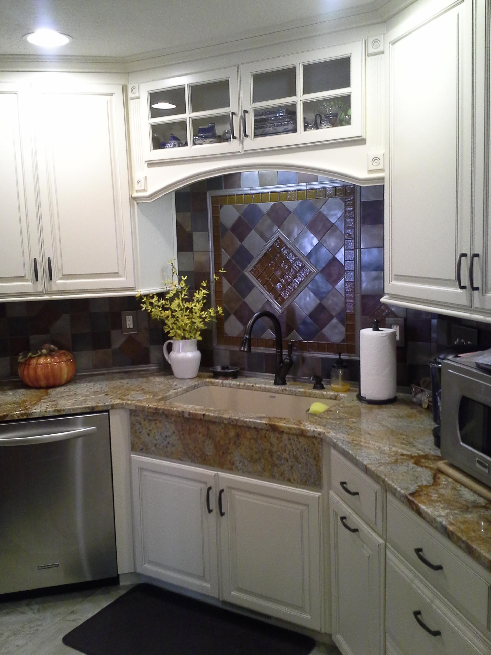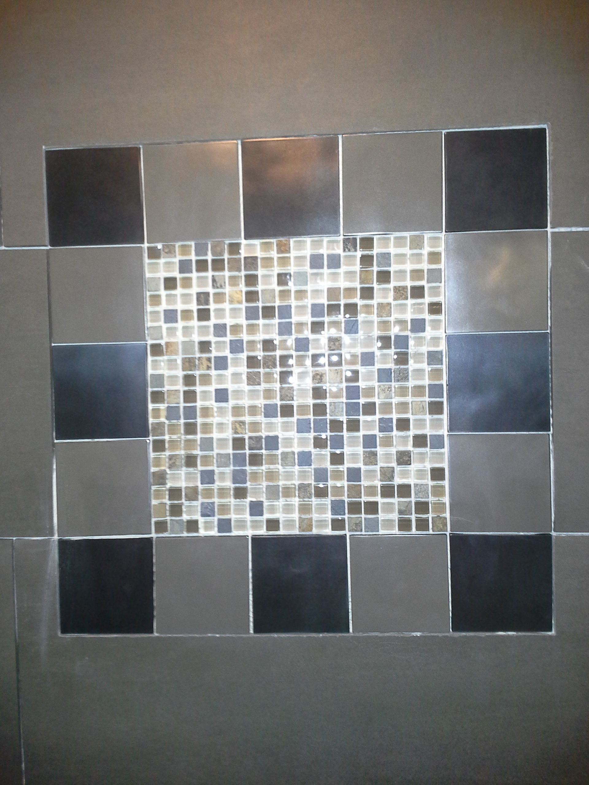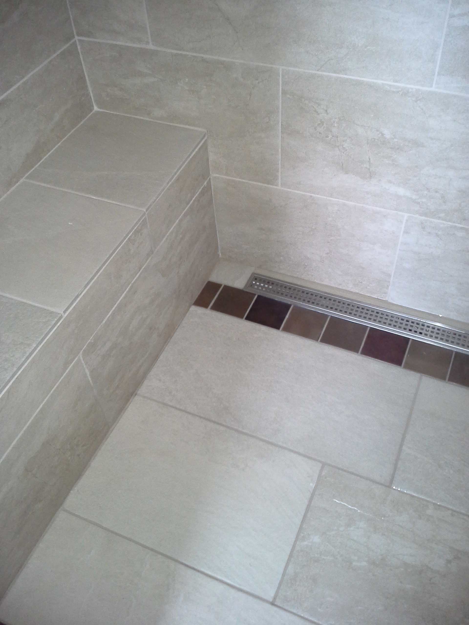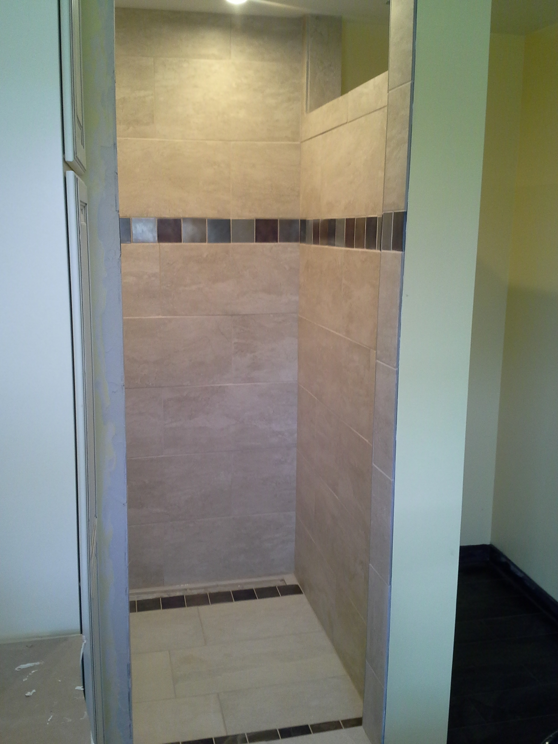 • 1/2 Travertine and linear mosaic Wall cabinet spice pull out Back Wall Accent in Tub/Shower This is the shower alcove/niche with metal tile accents. Here is the bench seat and linear drain with metal tile accent This is a full vessel bowl application. There are also partial vessels which I have photos for. This shower has a full bench seat, Alcove/Niche, Linear Drain & Metal tile accents. Notice shorter wall which allows the exhaust fan to work for both shower & toilet. Custom designed Amish Cabinets with wall tile. This is a small area encumbered by two openings.