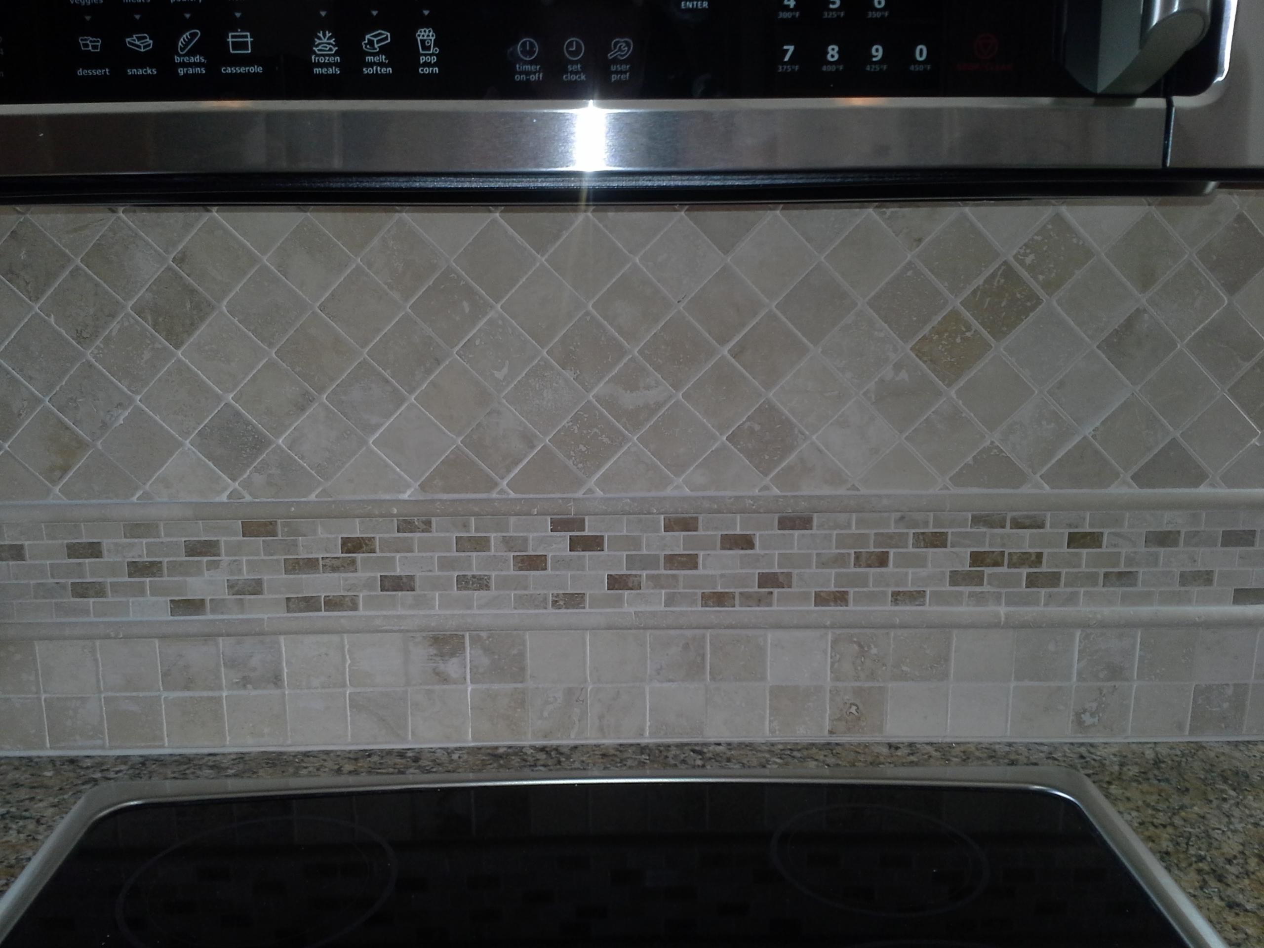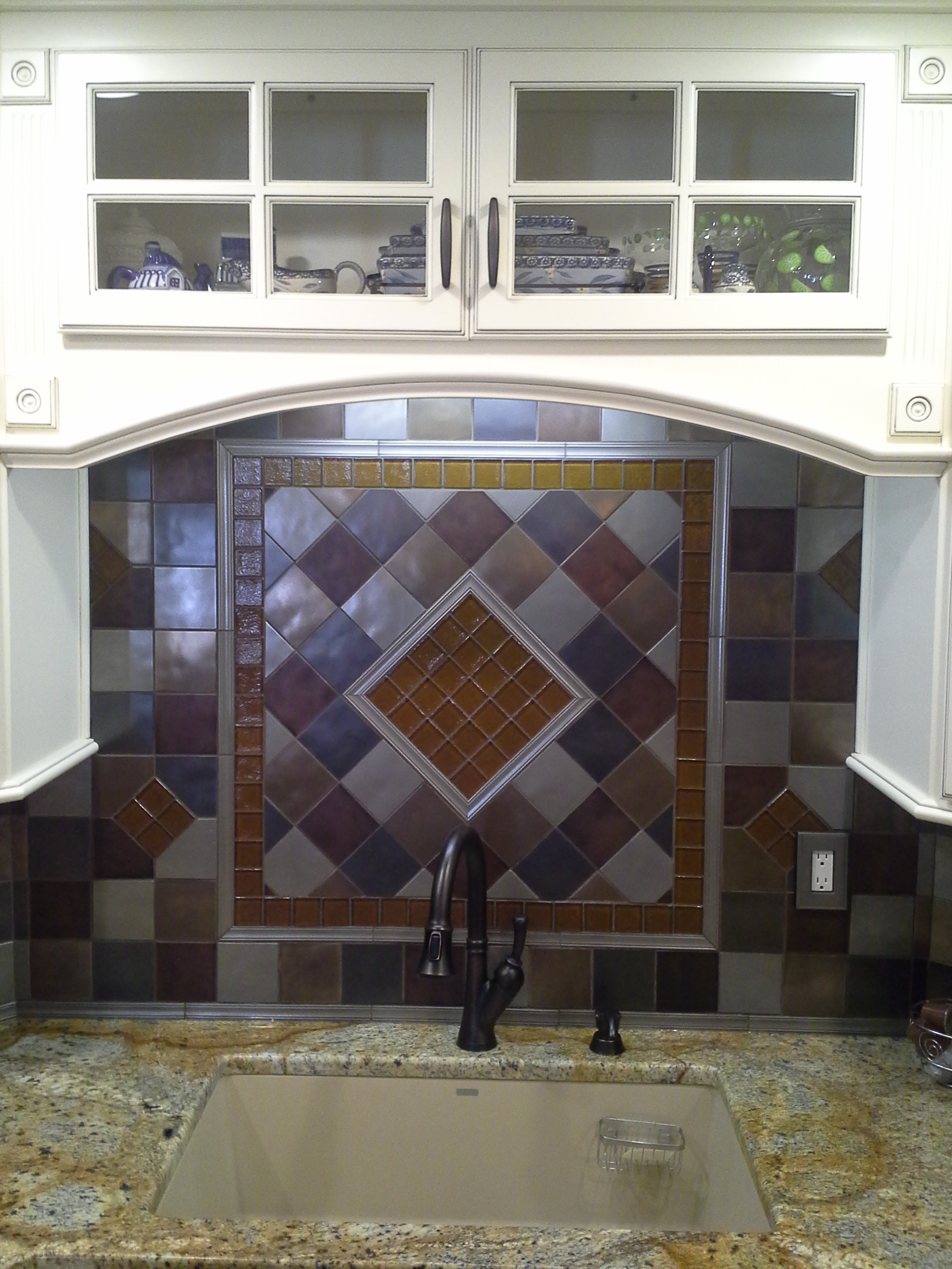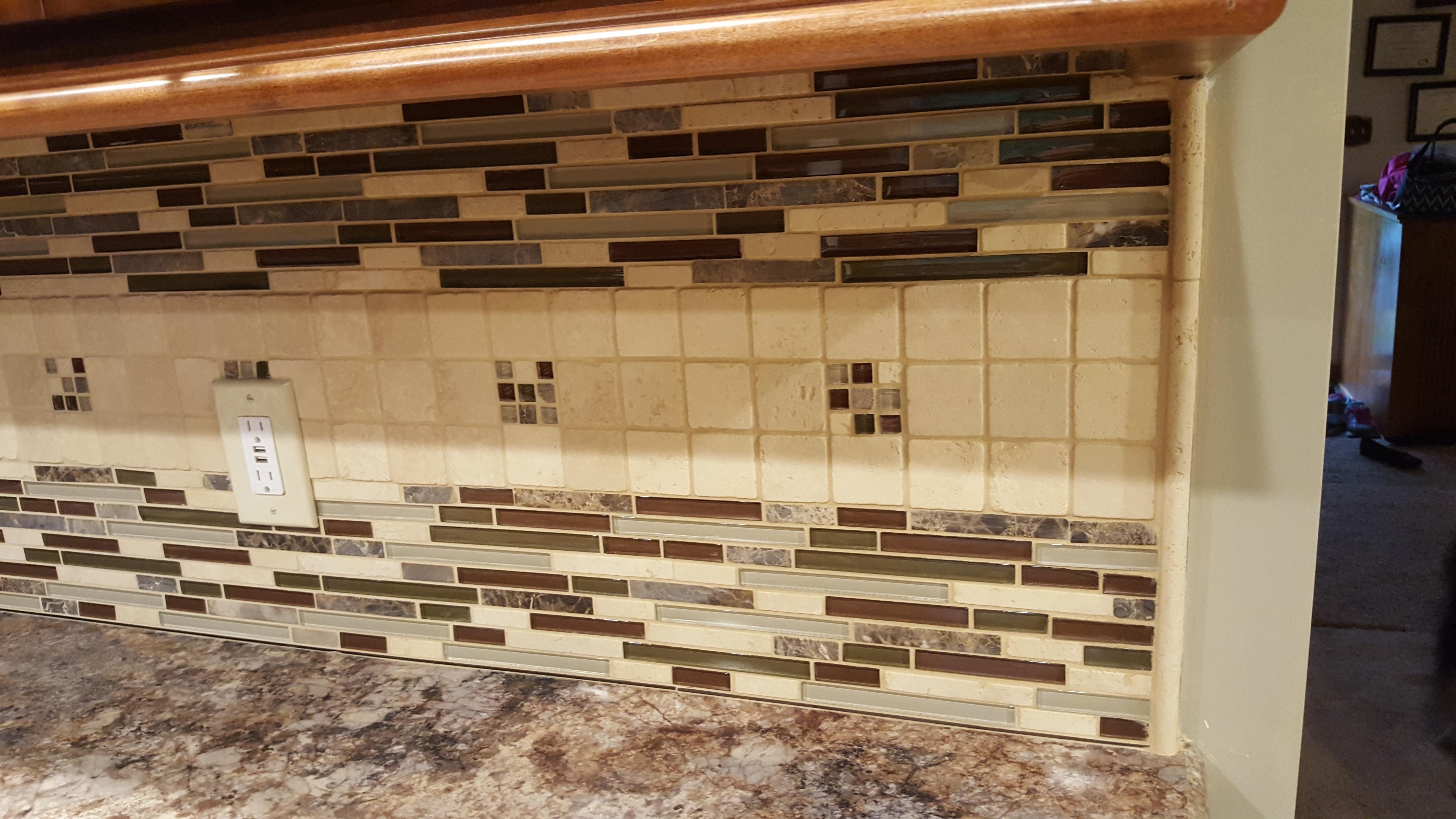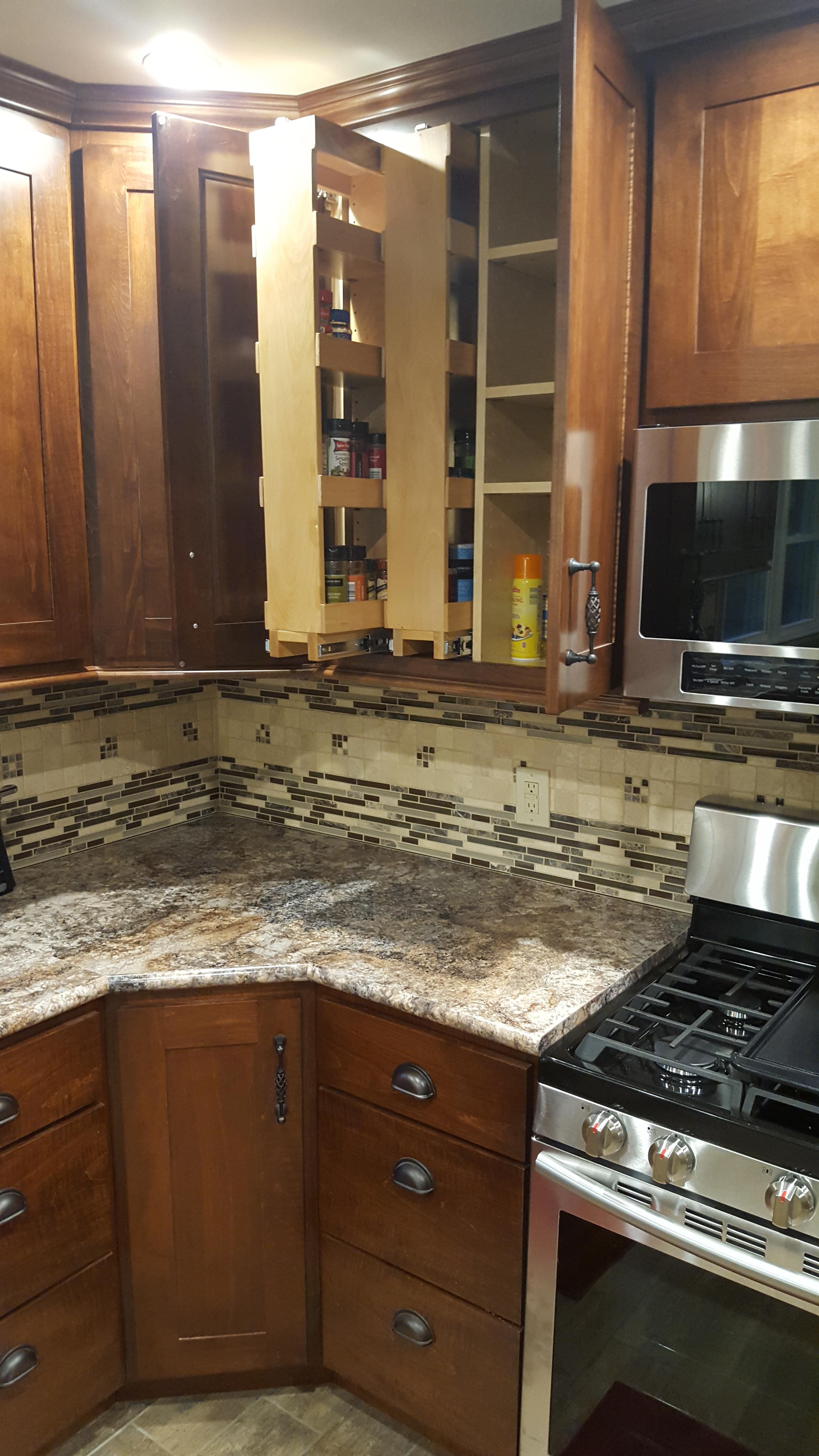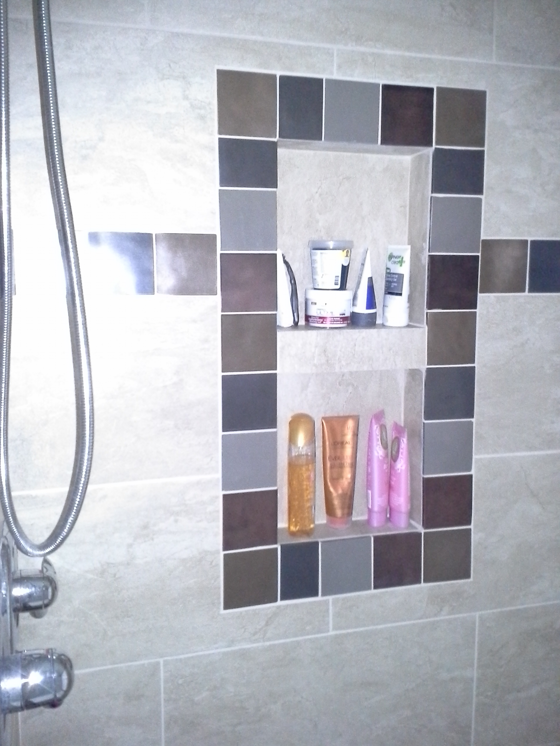 • 1/2 Travertine and linear mosaic Wall cabinet spice pull out Back Wall Accent in Tub/Shower This is the shower alcove/niche with metal tile accents. Here is the bench seat and linear drain with metal tile accent This is a full vessel bowl application. There are also partial vessels which I have photos for. This shower has a full bench seat, Alcove/Niche, Linear Drain & Metal tile accents. Notice shorter wall which allows the exhaust fan to work for both shower & toilet. Custom designed Amish Cabinets with wall tile. This is a small area encumbered by two openings.