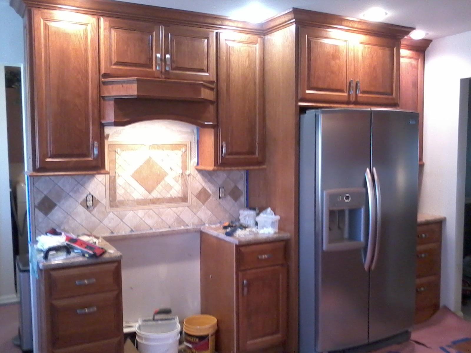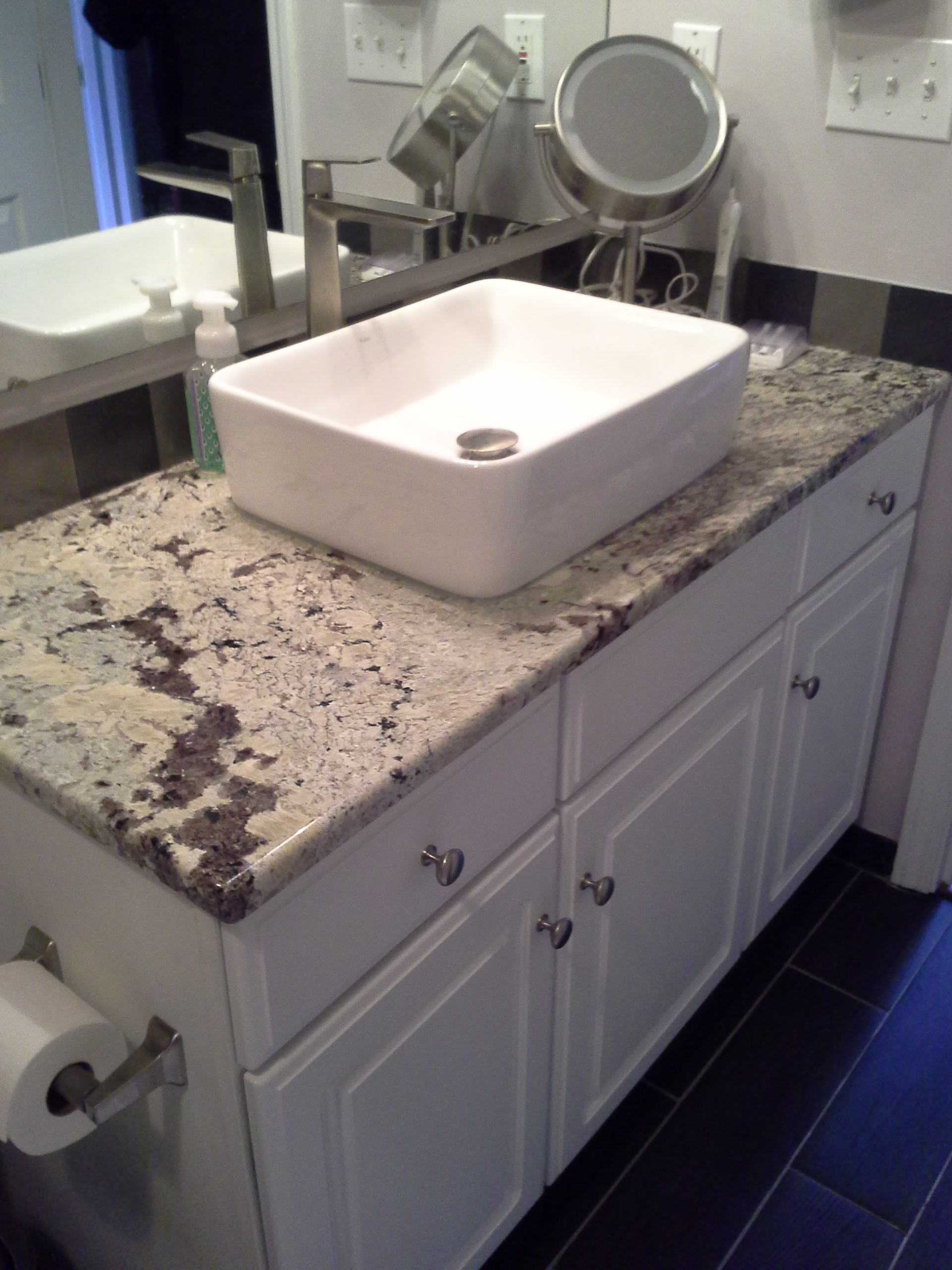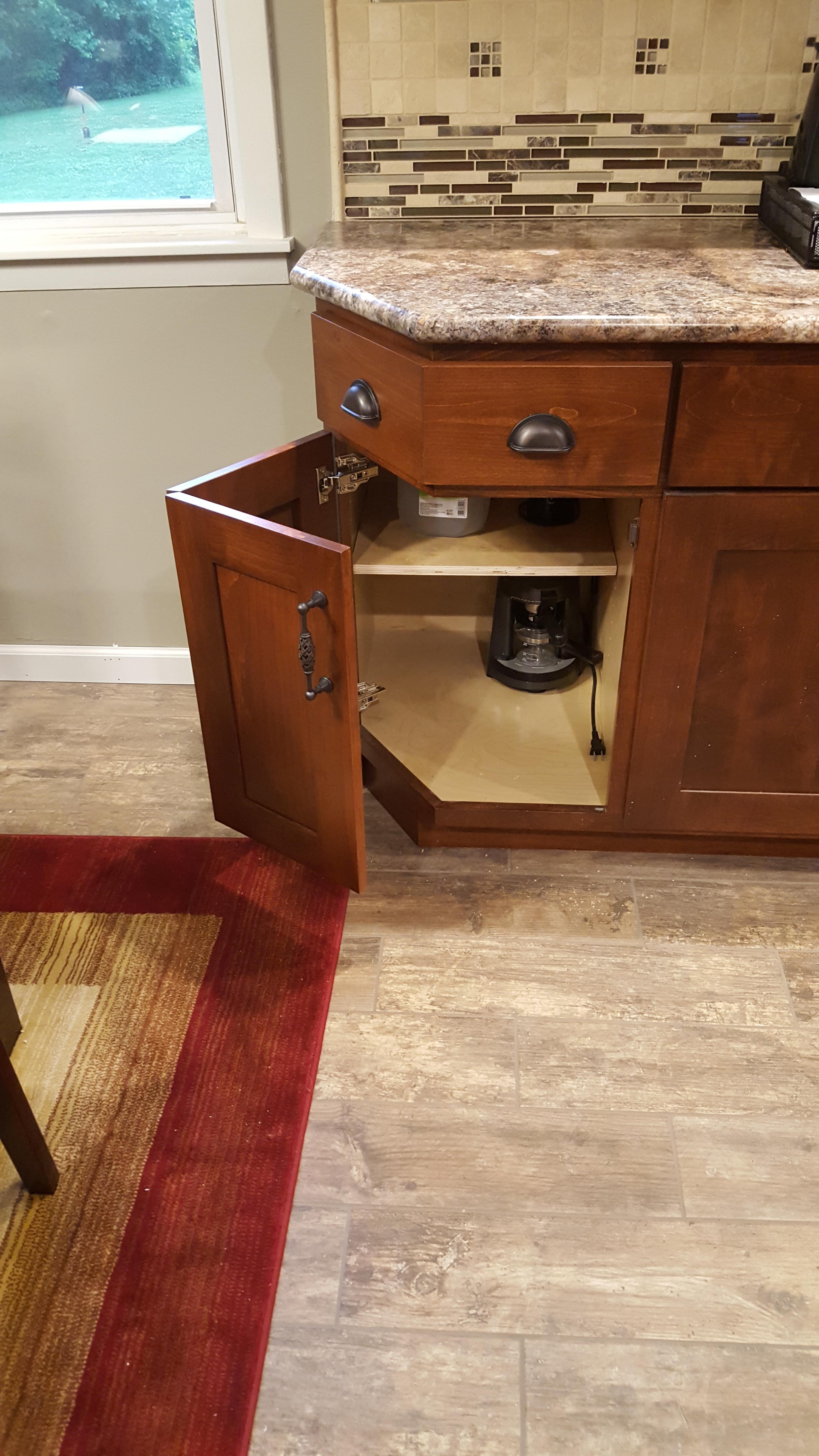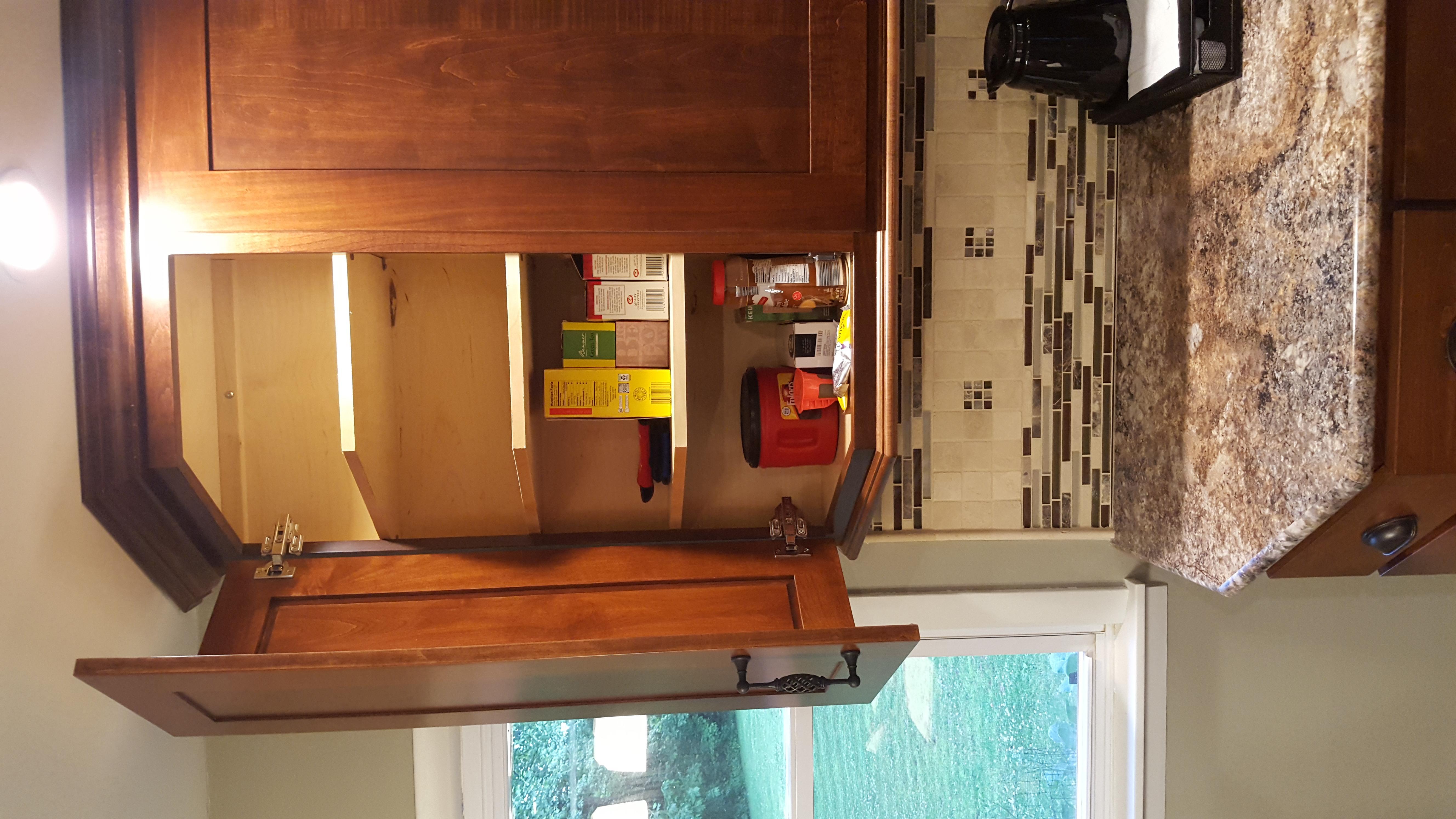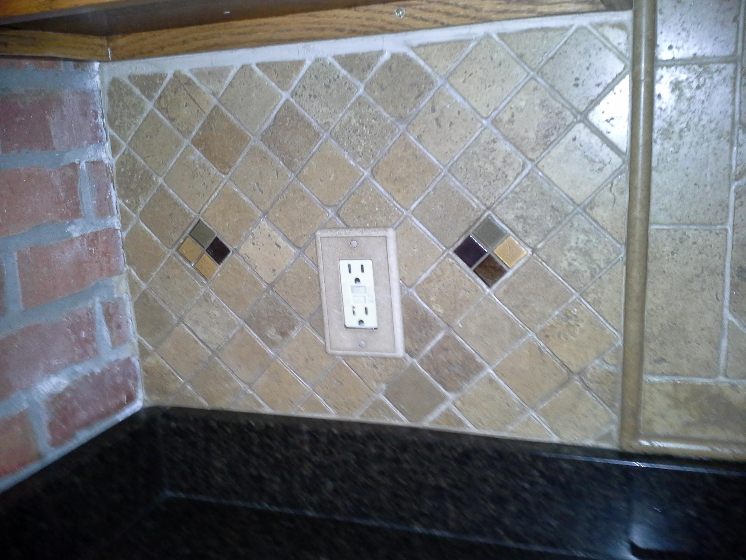 • 1/2 Travertine and linear mosaic Wall cabinet spice pull out Back Wall Accent in Tub/Shower This is the shower alcove/niche with metal tile accents. Here is the bench seat and linear drain with metal tile accent This is a full vessel bowl application. There are also partial vessels which I have photos for. This shower has a full bench seat, Alcove/Niche, Linear Drain & Metal tile accents. Notice shorter wall which allows the exhaust fan to work for both shower & toilet. Custom designed Amish Cabinets with wall tile. This is a small area encumbered by two openings.