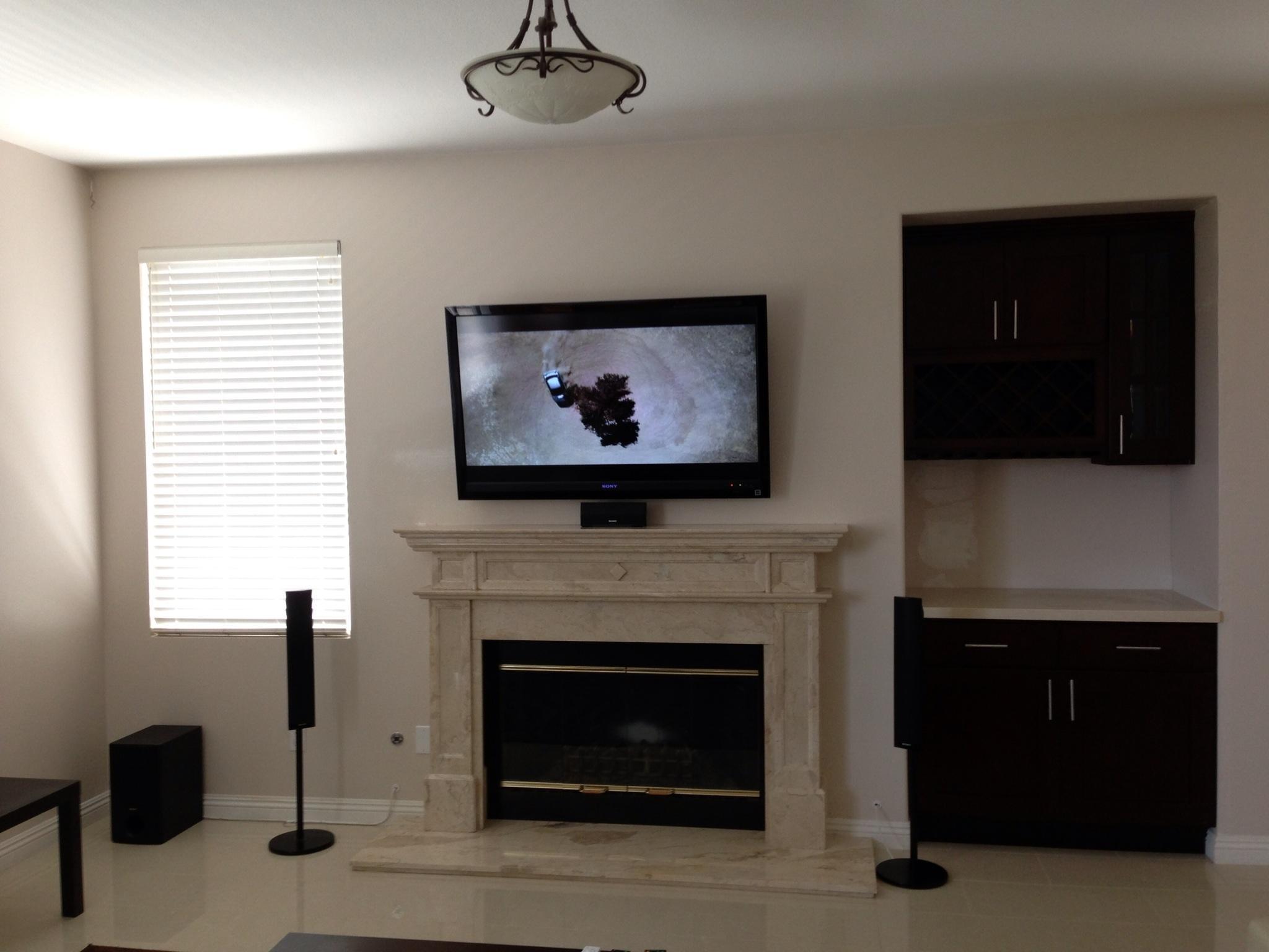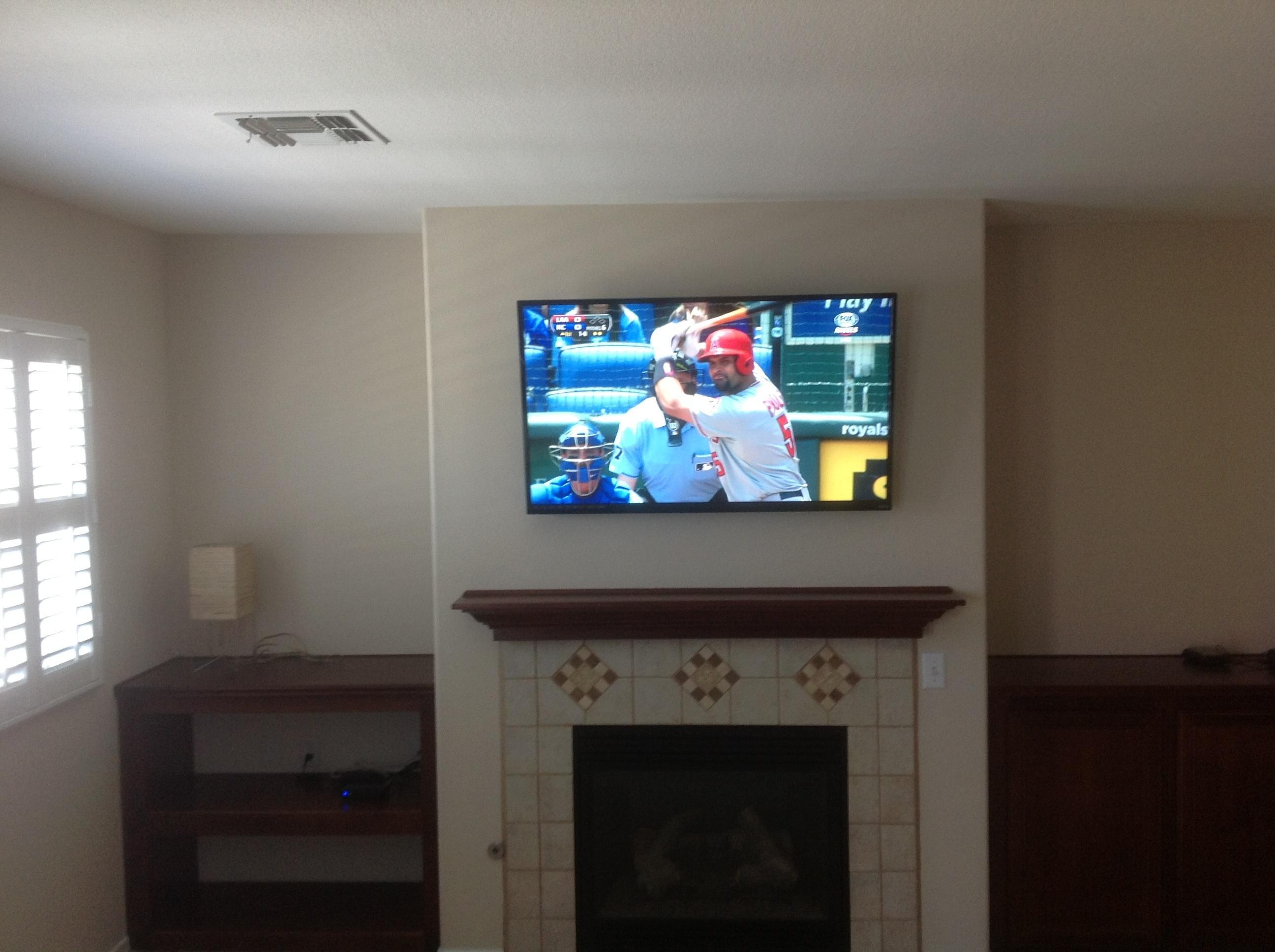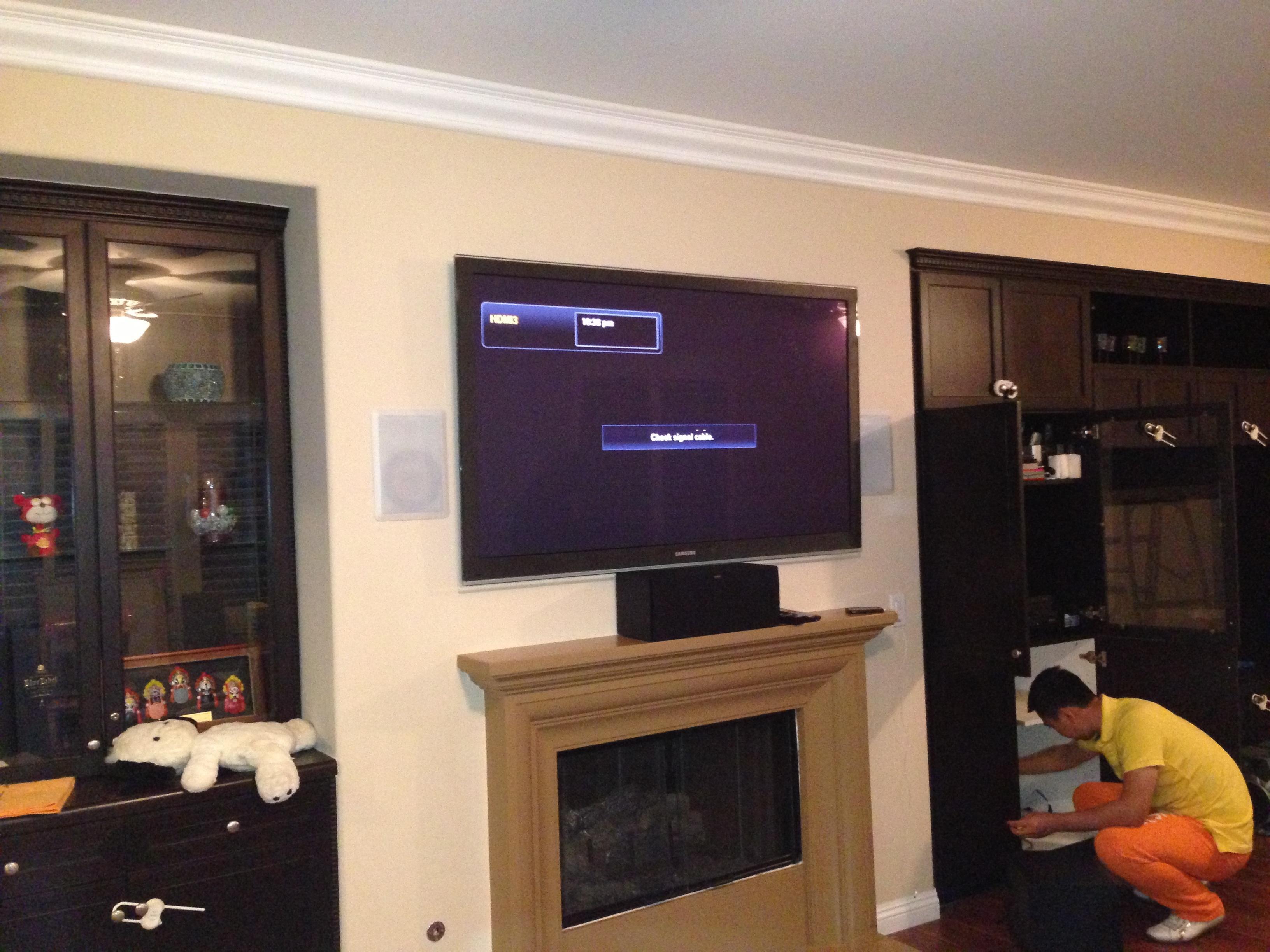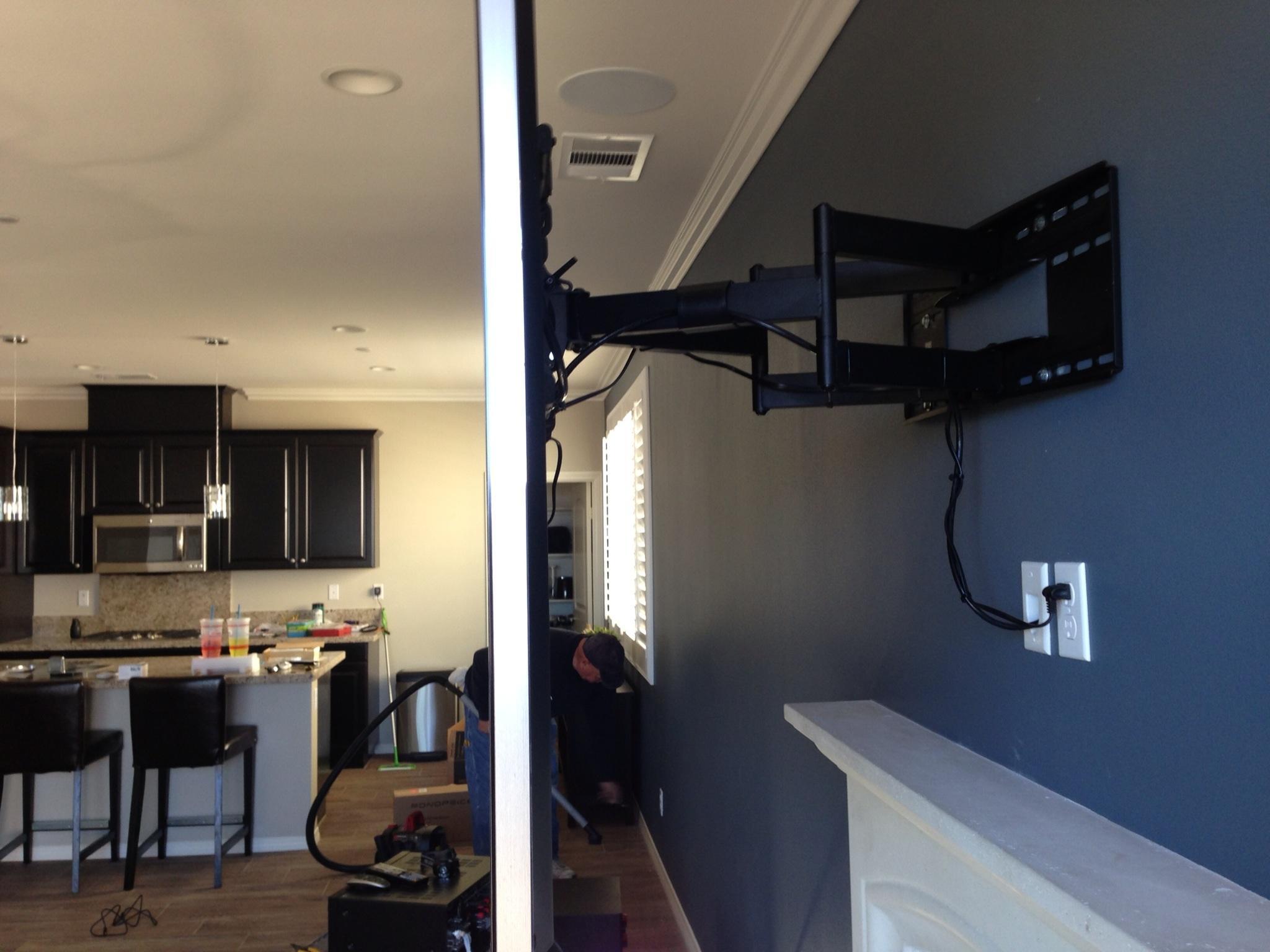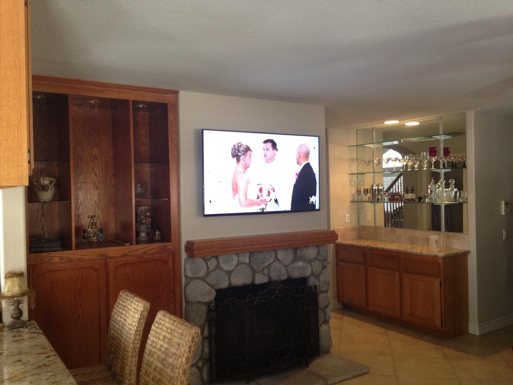 • 75 65 80 37 Home theater room in loft.  mount BenQ HD projector, 120 Home theater projector calibration. 120 120 Commercial Salon tv installation. Organization is our way to stay on top of production. Commercial cafeteria 4@46 We wall mounted both 70 Martin Logan wall mounted array. Commercial outdoor IP CCTV. Dave installing center in-ceiling speaker 5.1 system. Sometimes ceiling mounts can be used to provide a modern look, cabling gets concealed in pipe mount. 46 Dave up high running CCTV cabling for (8) camera system outdoor produce company. Big bear cabin speaker system 3@ pairs of speakers in three rooms with 5.1 in main living area, wall mounted 55 This client already had electrician run power to location on surface of wall, we came in and mounted tv, concealed our cabling. Commercial projector conference room. Ceiling mounted HDMI, VGA, audio. 80 Built in wall unit installed 75 Twin 55 60 65 60 Full Russsound audio system outdoor 6 zone 65 Grado spa 40 Client has existing small niche we framed out area mounted full motion mount. This shot is behind install, when tv is pushed back hides hole. 65 Big bear cabin in-wall speakers 70 We sell and install Samsung commercial displays. This was for a local trucking company dispatch displays. 60 55 55 60 60 Dual outdoor patio displays. Installing 7.1 in-ceiling speakers. Full motion mount for this 75 55 60 Commercial CCTV POE system. 35k warehouse cable runs. Whole house speaker system , these were in the tarazzo shower. This small cubby was transformed with framing to support 55 Tv over framed out area client wanted under area for there devices. Client had contractor tell her that this plaster brick fireplace was not possible to install and conceal cabling. 65 Residential 16 channel CCTV set up programming DVR. 60 42 Small Samsung game room tv, client installed tv. We were needed to come in and conceal cabling running down wall. 03/11/15 Again client pre mounted this tv we were called in to conceal cabling running between tv and dresser. 03/11/15 Tv in alcove area 03/13/15 One of three tv installed  with 5.1 in ceiling speakers post wire 03/14/15 Wall mounted floating A/V furniture sold and installed. Available in Expresso and Chocolate.