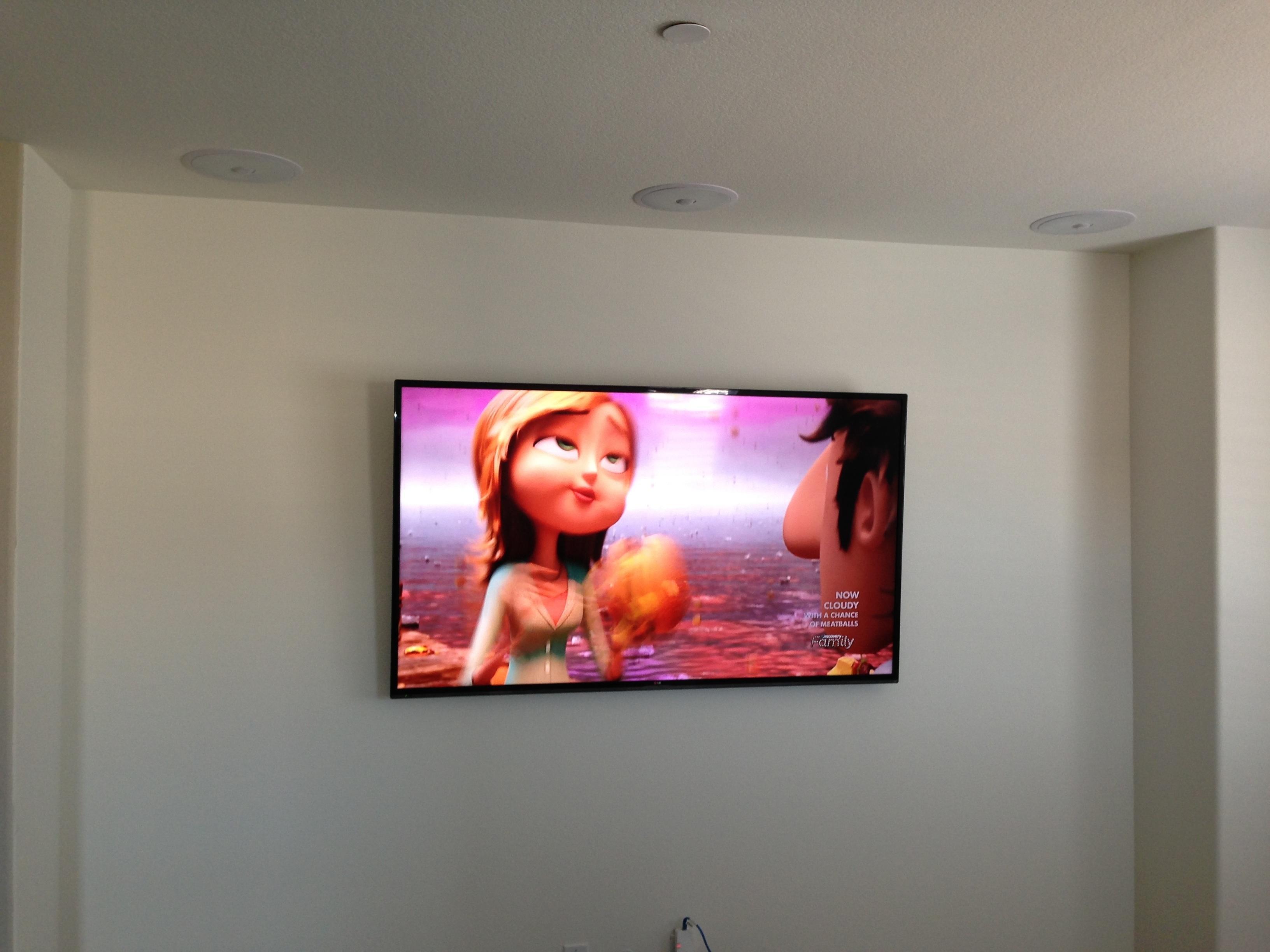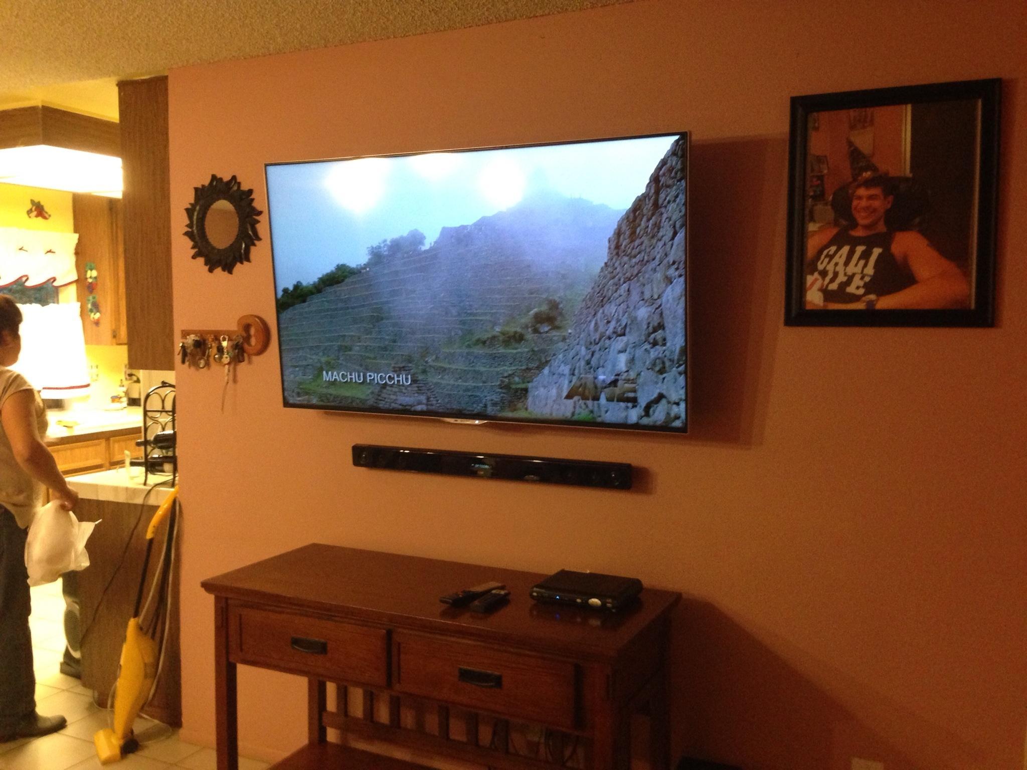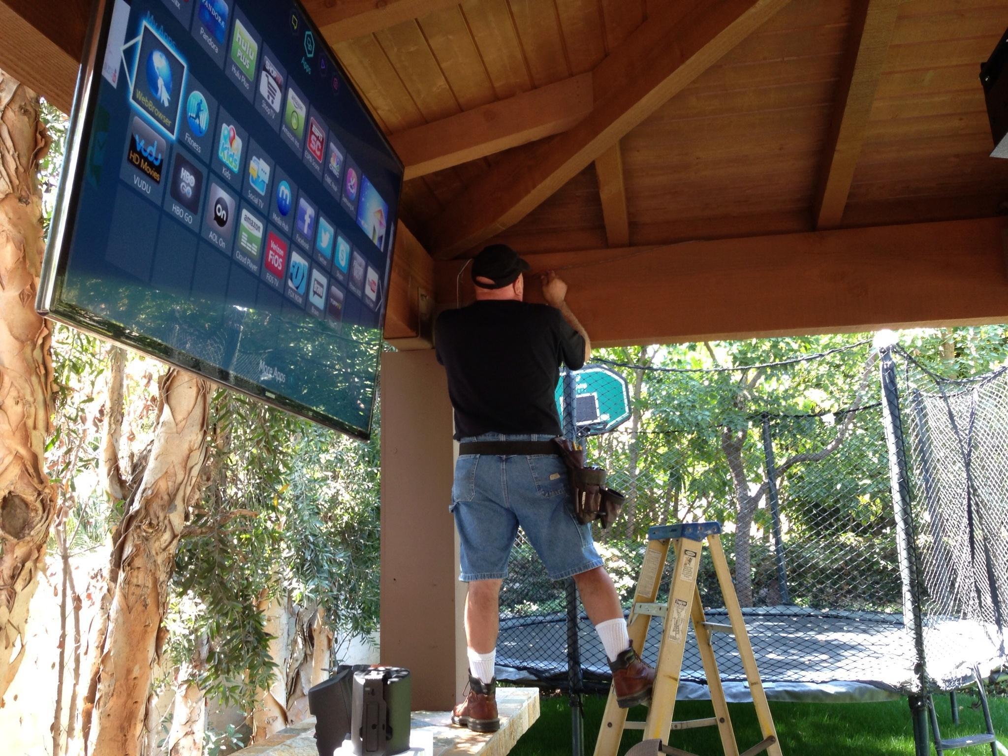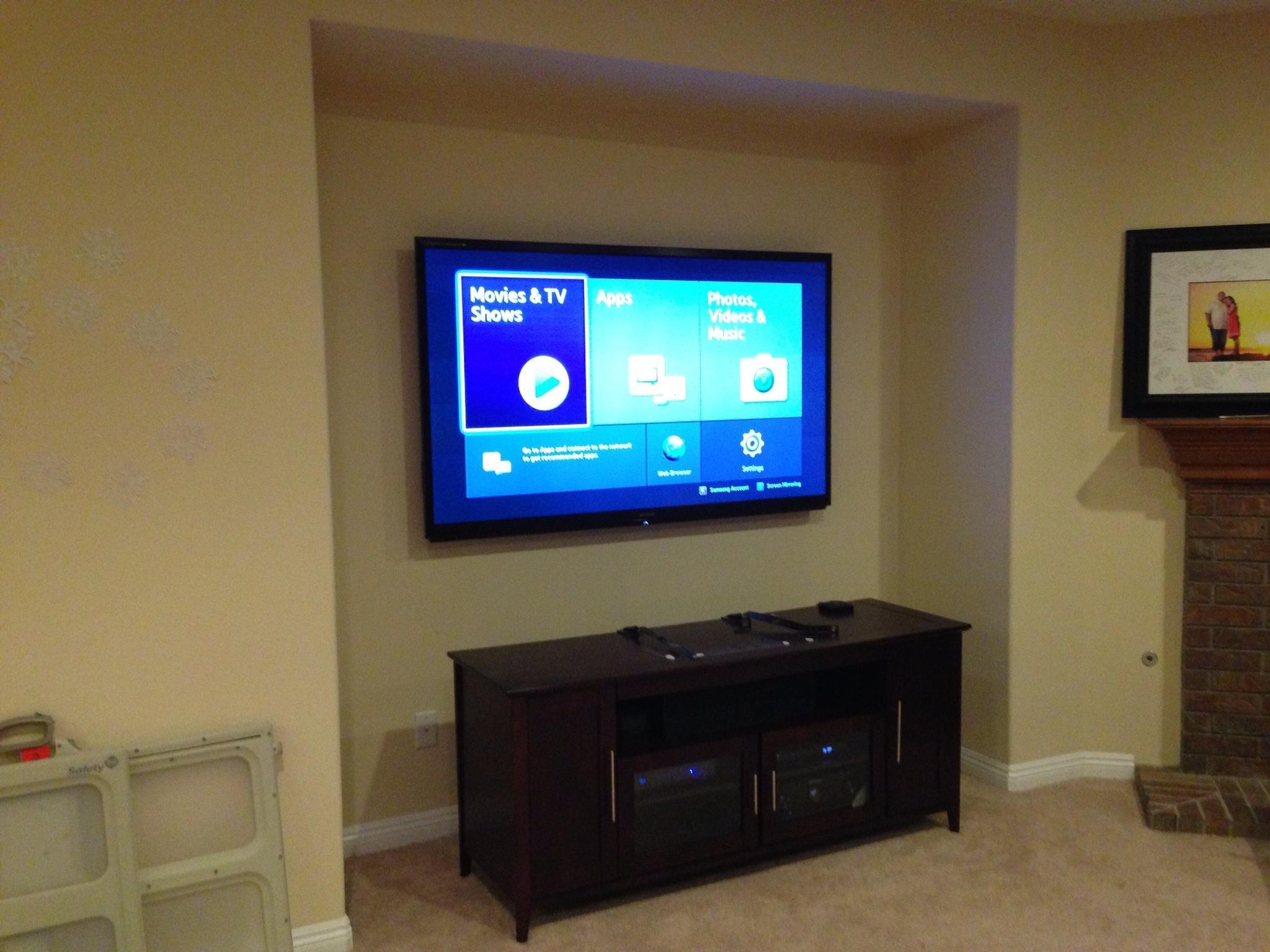 • 75 65 80 37 Home theater room in loft.  mount BenQ HD projector, 120 Home theater projector calibration. 120 120 Commercial Salon tv installation. Organization is our way to stay on top of production. Commercial cafeteria 4@46 We wall mounted both 70 Martin Logan wall mounted array. Commercial outdoor IP CCTV. Dave installing center in-ceiling speaker 5.1 system. Sometimes ceiling mounts can be used to provide a modern look, cabling gets concealed in pipe mount. 46 Dave up high running CCTV cabling for (8) camera system outdoor produce company. Big bear cabin speaker system 3@ pairs of speakers in three rooms with 5.1 in main living area, wall mounted 55 This client already had electrician run power to location on surface of wall, we came in and mounted tv, concealed our cabling. Commercial projector conference room. Ceiling mounted HDMI, VGA, audio. 80 Built in wall unit installed 75 Twin 55 60 65 60 Full Russsound audio system outdoor 6 zone 65 Grado spa 40 Client has existing small niche we framed out area mounted full motion mount. This shot is behind install, when tv is pushed back hides hole. 65 Big bear cabin in-wall speakers 70 We sell and install Samsung commercial displays. This was for a local trucking company dispatch displays. 60 55 55 60 60 Dual outdoor patio displays. Installing 7.1 in-ceiling speakers. Full motion mount for this 75 55 60 Commercial CCTV POE system. 35k warehouse cable runs. Whole house speaker system , these were in the tarazzo shower. This small cubby was transformed with framing to support 55 Tv over framed out area client wanted under area for there devices. Client had contractor tell her that this plaster brick fireplace was not possible to install and conceal cabling. 65 Residential 16 channel CCTV set up programming DVR. 60 42 Small Samsung game room tv, client installed tv. We were needed to come in and conceal cabling running down wall. 03/11/15 Again client pre mounted this tv we were called in to conceal cabling running between tv and dresser. 03/11/15 Tv in alcove area 03/13/15 One of three tv installed  with 5.1 in ceiling speakers post wire 03/14/15 Wall mounted floating A/V furniture sold and installed. Available in Expresso and Chocolate.