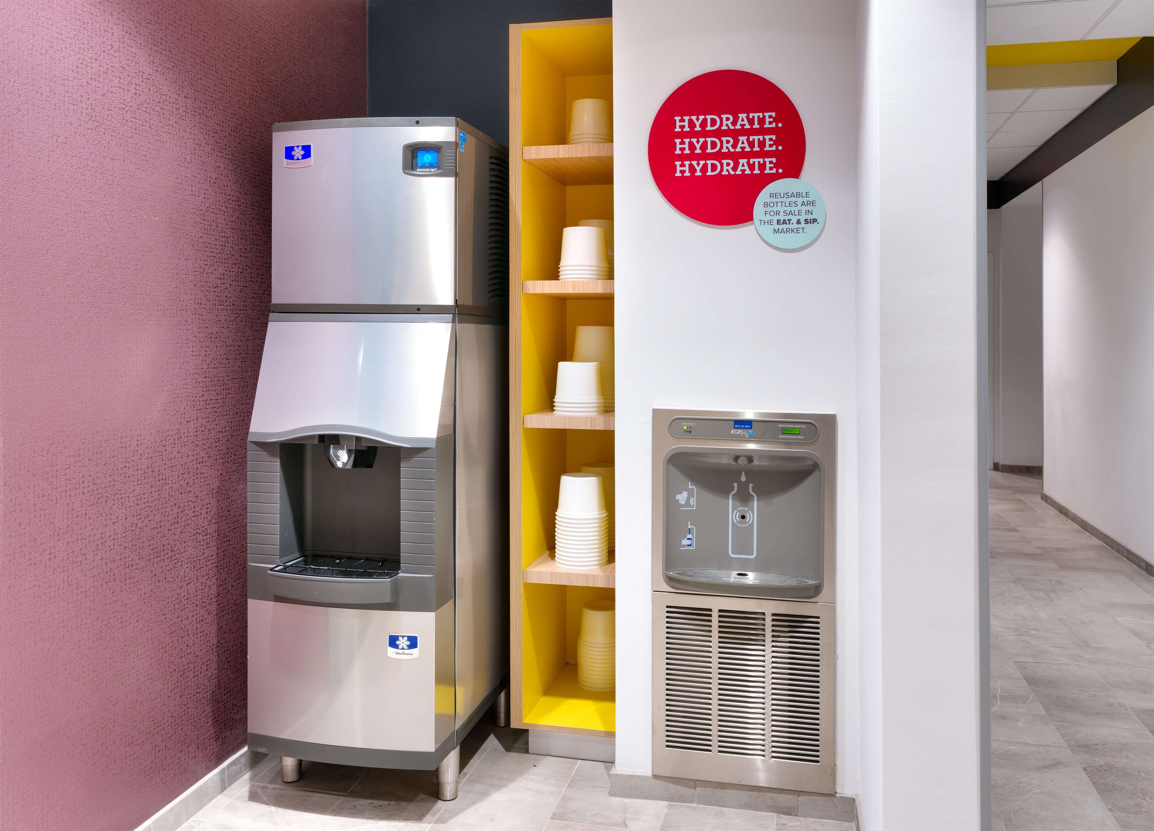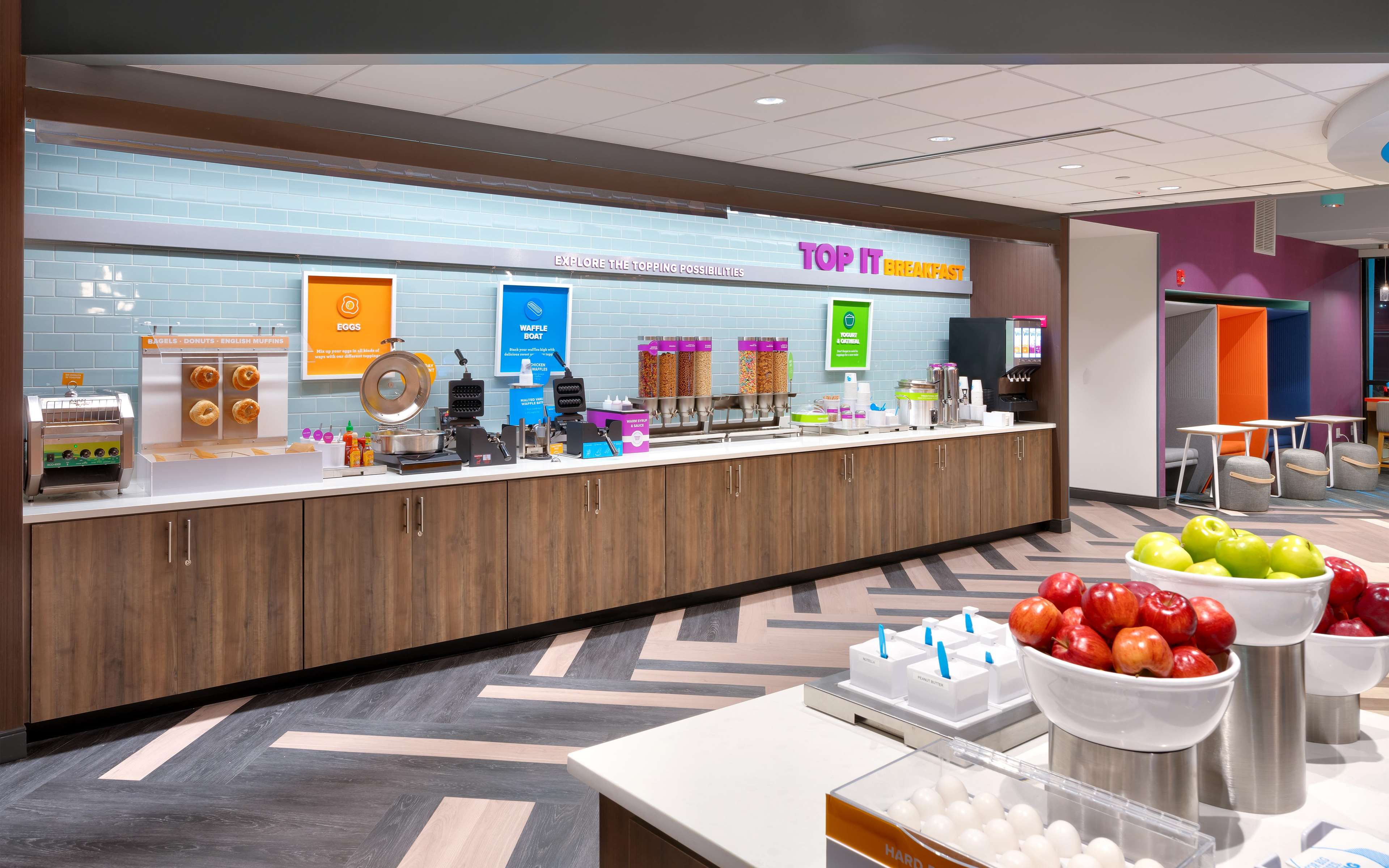 Build a yummy masterpiece at our breakfast bar with 30 sweet and savory toppings for bagels, yogurt, oatmeal and more. You’ll always find drinks, gourmet snacks and single-serve beer and wine in the 24/7 market.